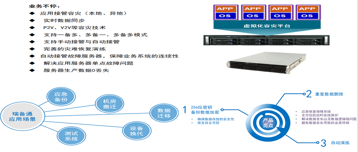 • 爲各應用服務器提供全面(miàn)應用容災能(néng)力,保障業務連續性 • 爲各服務器數據提供了基于秒級的CDP備份保護措施,實時(shí)自動保護各業務數據 • 保障信息化平台各環節業務的連續性與數據安全存儲。